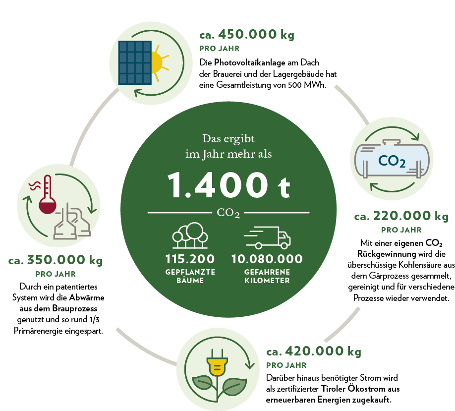 Ein Beispiel mehr für die erfolgreiche nachhaltige Kreislaufwirtschaft ist die Verwertung von Trebern und Hefe, die als wertvolles Futtermittel von Bäuerinnen und Bauern genutzt werden. Ausgeschiedenes Glas aus dem Brauprozess findet in der Herstellung von Verkehrsleitsystemen Wiederverwendung. Darüber hinaus wird die bei der Gärung entstehende Kohlensäure gesammelt, gereinigt und im Abfüllprozess verwendet.